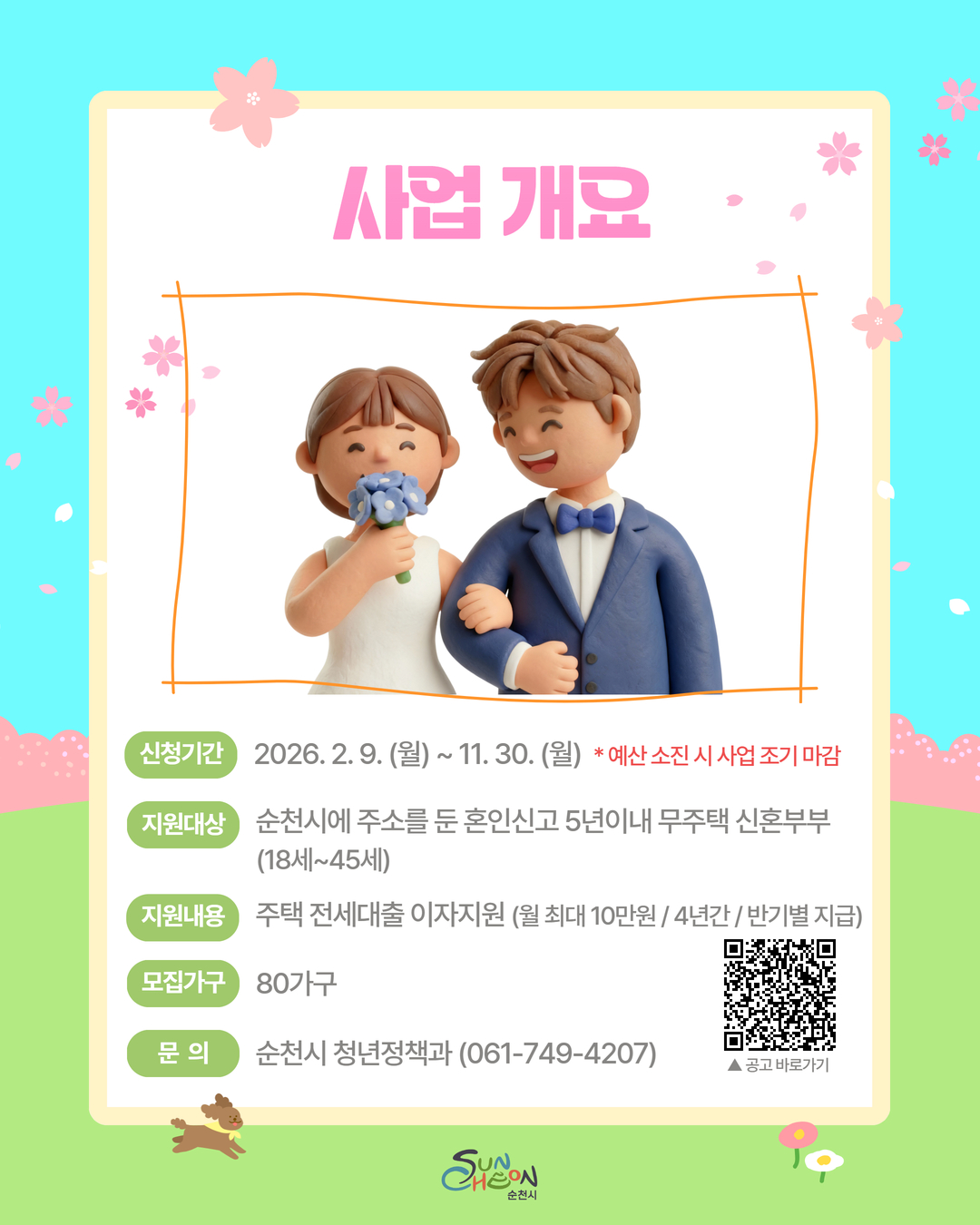 - 대 상: 순천시에 주소를 둔 혼인신고 5년이내 신혼부부(18세~45세)