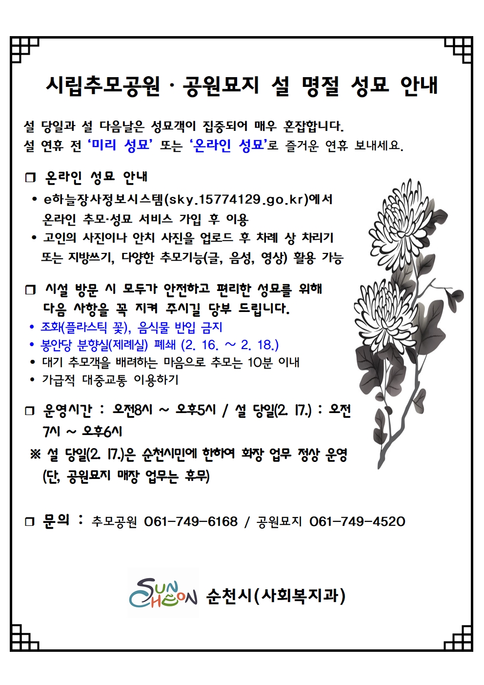 시립추모공원⋅공원묘지 설 명절 성묘 안내