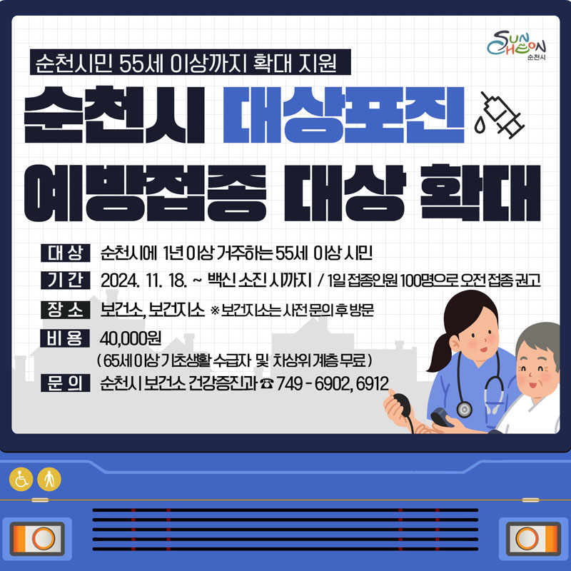 순천시 대상포진 예방접종 지원사업 대상을 55세 이상으로 확대합니다.