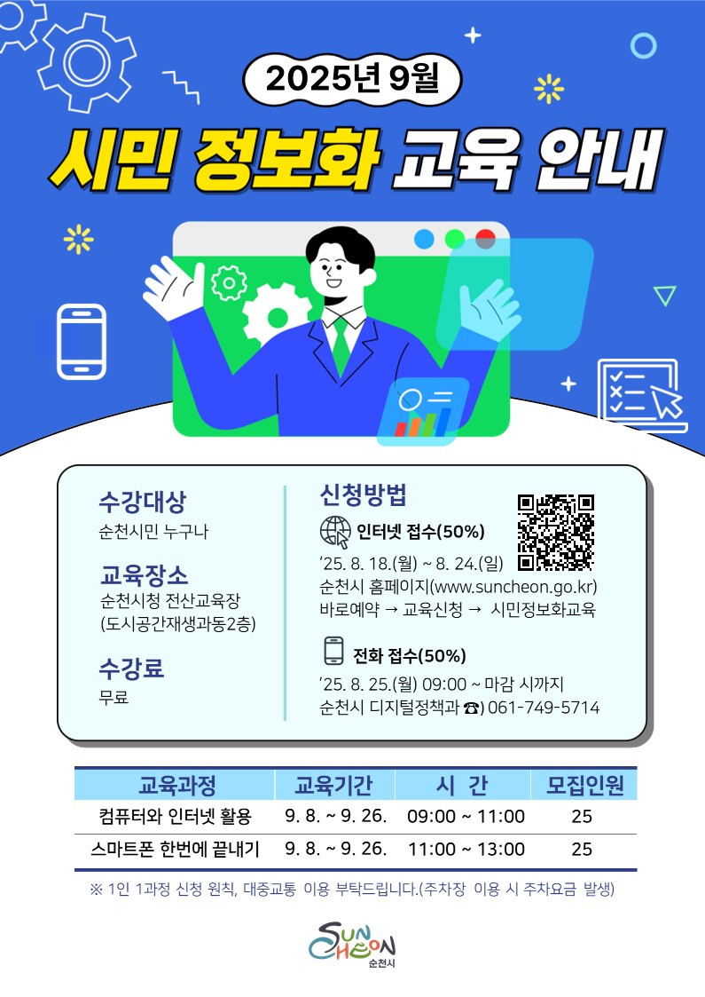 - 인터넷 접수 (50%) : '25. 8. 18.( 월 ) ~ 8. 24.( 일 ) / 시 홈페이지-바로예약-교육신청-시민정보화교육