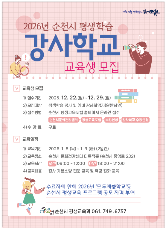 ※ 수료자에 한해 2026년 모두愛학교 등 순천시 평생교육 프로그램 운영 공모 자격 부여